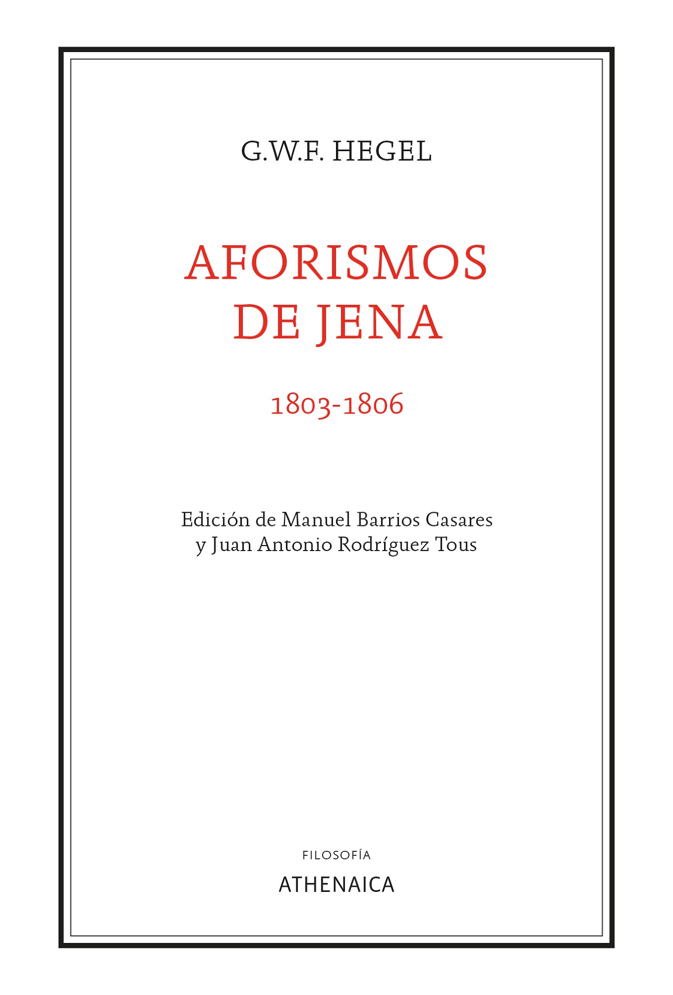 Escritos en un estilo desenfadado y directo, los Aforismos de Jena fueron redactados por Hegel entre 1803 y 1806, años en los que comenzó a componer su primera gran obra, la Fenomenología del Espíritu. El filósofo alemán somete aquí su propio tiempo a un juicio sumarísimo: el mundo moderno, época del triunfo de la Razón y la Libertad, tiene poderosos enemigos, y contra ellos dirige sus invectivas, siempre certeras. Nostálgicos del Antiguo Régimen, románticos anti-ilustrados o viejos racionalistas escolásticos son vapuleados con una contundencia rayana en ocasiones con un hilarante gamberrismo intelectual. La mordacidad de Hegel no se limita a los debates filosóficos o políticos del periodo, sino que se extiende asimismo a la nueva mentalidad pequeño-burguesa. Sus ácidos apuntes sobre el auge del narcisismo sentimental, tan por desgracia vigente en nuestros días, no han perdido un ápice de validez. Merece la pena descubrir a este otro Hegel, pensador entregado a la crítica de la cultura antes que a la disquisición metafísica. Al cuidado de Manuel Barrios Casares y Juan Antonio Rodríguez Tous, esta nueva edición bilingüe de los Aforismos se acompaña de una esclarecedora introducción y de un aparato crítico de notas que localiza citas y referencias ignoradas hasta la fecha.