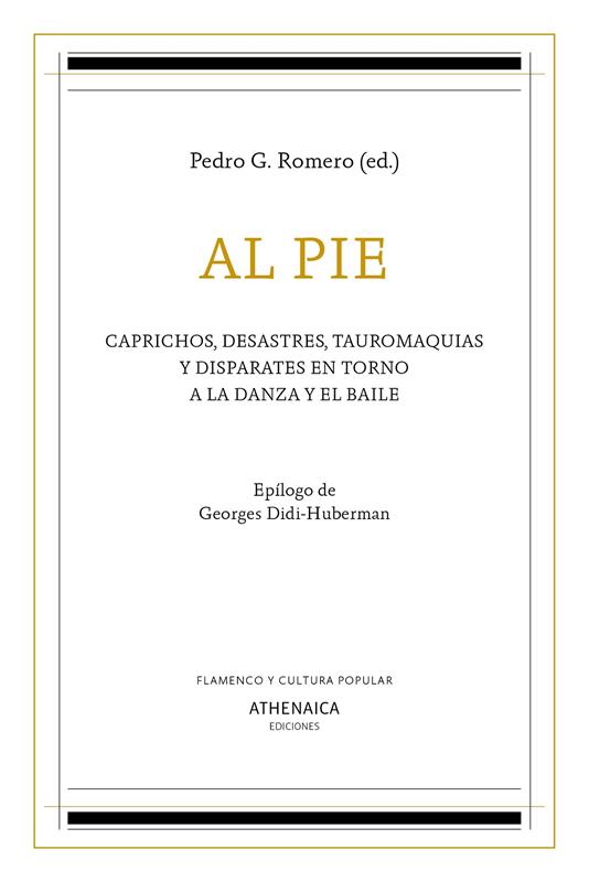Se reúnen de nuevo, con algunas novedades añadidas, las escrituras libérrimas que hace ya más de veinte años Pedro G. Romero encargó a una serie de artistas y teóricos como textos de apoyo a los Talleres que el propio autor iba a impartir en el Centro Andaluz de Danza. De aquella experiencia surgieron posteriores colaboraciones y el proyecto fue el origen de una revolución en la danza y el baile flamenco —entendidos aquella como expresión reglada y culta y este como la libre expresión popular del cuerpo en movimiento— que hoy contemplamos con regocijo en varias compañías, pero cuyo origen puede situarse en el estreno de Los zapatos rojos de Israel Galván. Desde muy diversos puntos de vista, en una especie de polifonía que engloba diferentes mundos, el baile y la danza son analizados para ir más allá de las líneas estrictas en las que por entonces se movían. El poeta y filólogo Agustín García Calvo y el filósofo Giorgio Agamben presentan textos fundantes de una manera de entender las artes escénicas. Trabajos más intuitivos como los de Isabel Escudero, Esteban Pujals o David Pérez siguen la estela de pensar la danza y, en consecuencia, no explicarla, más bien entenderla como una forma distinta de pensamiento. En ese pensamiento lírico y sensual, pero sobre todo flamenco se mueven también las contribuciones de Ortiz Nuevo. Desde Nueva York, Kirby Gookin y Berta Sichel enfrentan, como dos adelantados a su tiempo, el movimiento del cuerpo con la técnica. Los textos de Estrella de Diego, Patricia Molins y Delfín Colomé conciben la danza como un arte especialmente femenino y feminista, mientras Julián Ruesga Bono lo hace desde sus intereses artísticos y textiles, y Antonio Álamo y Pepa Gamboa desarrollan sendas puestas en escena. A este festín se suman los textos del propio Pedro G. Romero, donde se apuntan las preguntas fundamentales de ese enfrentamiento danza/baile, y un epílogo de Georges Didi-Huberman que vale como broche, culminación y amalgama del resto de los contenidos del libro.