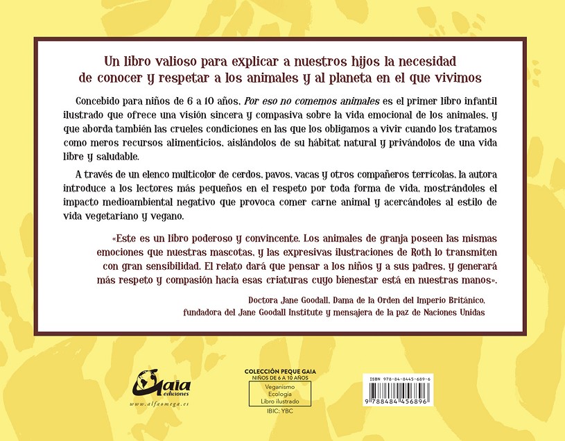 Concebido para niños de 6 a 10 años, Por eso no comemos animales es el primer libro infantil ilustrado que ofrece una visión sincera y compasiva sobre la vida emocional de los animales, y que aborda también las crueles condiciones en las que los obligamos a vivir cuando los tratamos como meros recursos alimenticios, aislándolos de su hábitat natural y privándolos de una vida libre y saludable.