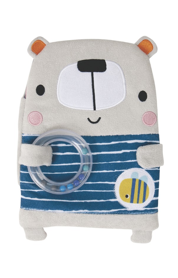 Un libro de tela y un sonajero para que los bebés observen, toquen y jueguen. También pueden usarlo como peluche.