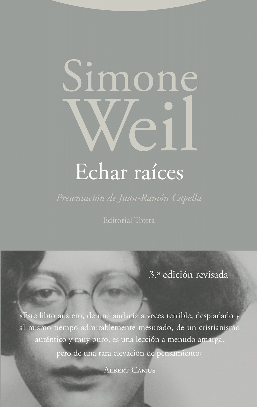 «Echar raíces quizá sea la necesidad más importante e ignorada del alma humana. Es una de las más difíciles de definir. Un ser humano tiene una raíz en virtud de su participación real, activa y natural en la existencia de una colectividad que conserva vivos ciertos tesoros del pasado y ciertos presentimientos de futuro.