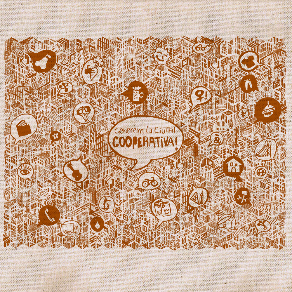 Arran d'una consulta que se'ns va fer per confeccionar unes bosses amb un tamany i una resistència majors, vam pensar que era una bona idea oferir un nou format de bossa més gran i còmoda destinada a les compres quotidianes que fem i a les cistelles ecològiques que anem a buscar cada setmana a la nostra cooperativa de consum. Aquest disseny ens recorda la majoria d'àmbits de consum de la nostra vida i apel·la a un model responsable i de proximitat, a través del qual també poguem generar la ciutat cooperativa que volem.